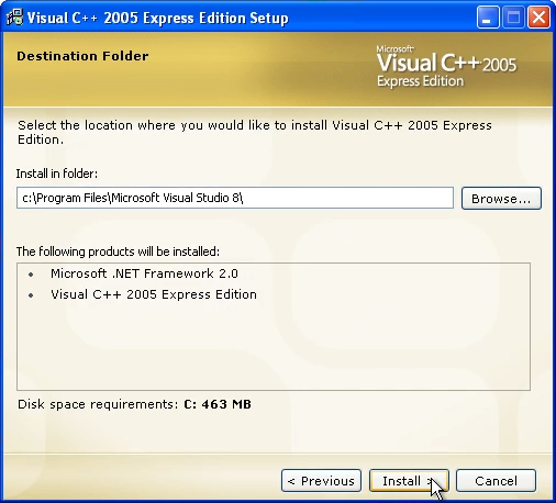 When you get to the path prompt, you are going to want to use the path you copied from the Visual Studio 2005 installer.
